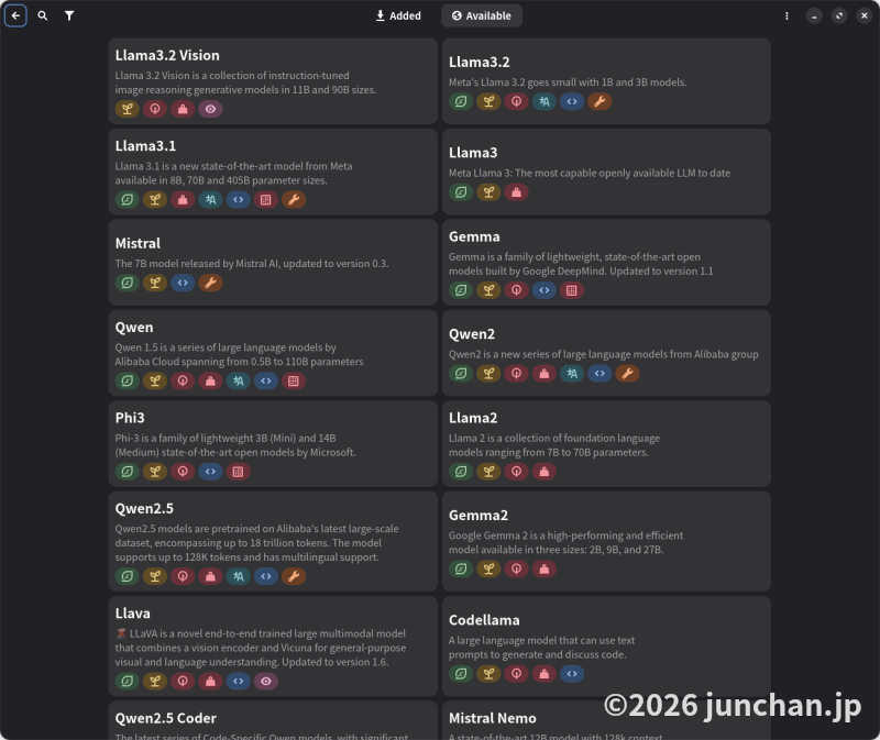 ちなみに、先にollamaコマンドでダウンロードしたモデルはAddedに収容されていて、すぐ使えるようになっていた。そのため、Availableにないものを使う場合は、ollamaコマンドでダウンロードしておくのがいいのだろう。